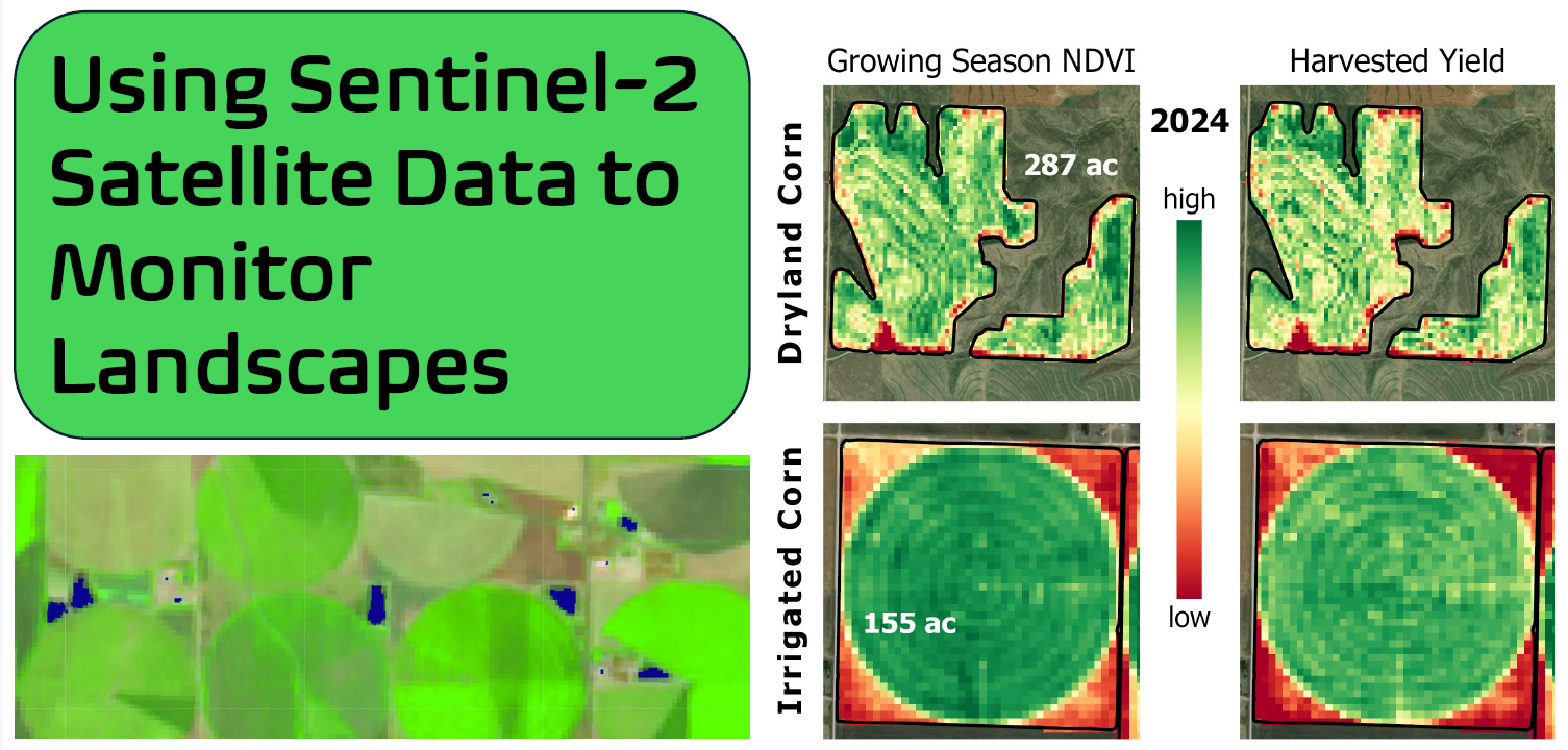 Dr. Dana Peterson, director of KansasView and senior research associate with Kansas Applied Remote Sensing, a program of the Kansas Biological Survey & Center for Ecological Research at The University of Kansas, will present on the Green Report and the Sentinel Green Report. The Green Reports use remotely sensed imagery to track vegetation greenness over time at different resolutions. The classic Green Report uses 1km imagery, and the Sentinel Green Report uses 10m imagery. The Green Report web app produces a series of maps; greenness, NDVI compared to the previous time period, NDVI compared to last year at that time, NDVI compared to the last time the same crop was grown, and NDVI compared to an average of all years, to help growers and land managers evaluate how vegetation changes across crops and rotations.